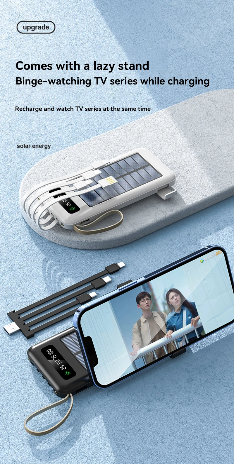 • Additional Features: Solar panel, LED torch, detachable cables, built-in stand